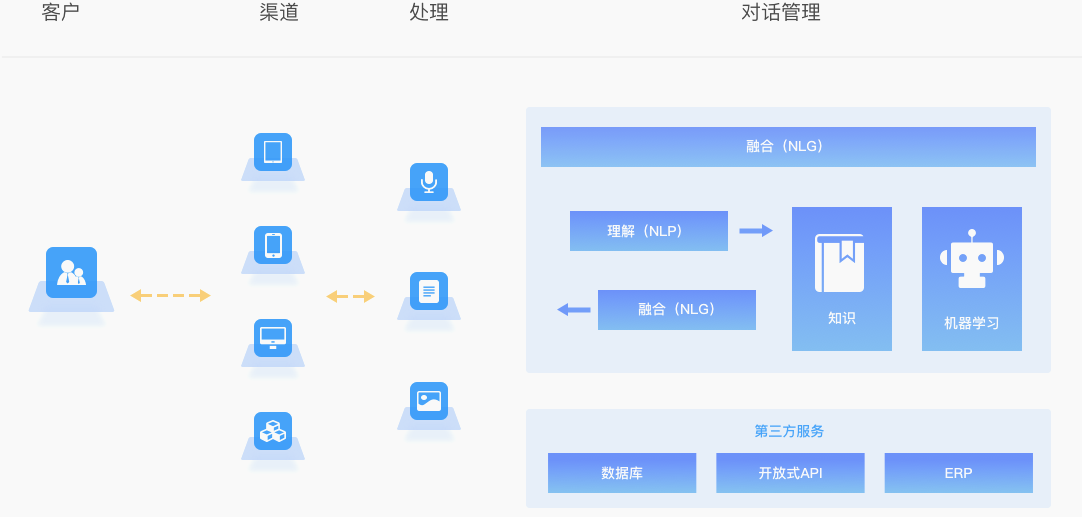 预装多行业领域智能场景,打通企业业务系统,针对复杂业务场景,理解客户意图,自动引导访客进入下一轮会话